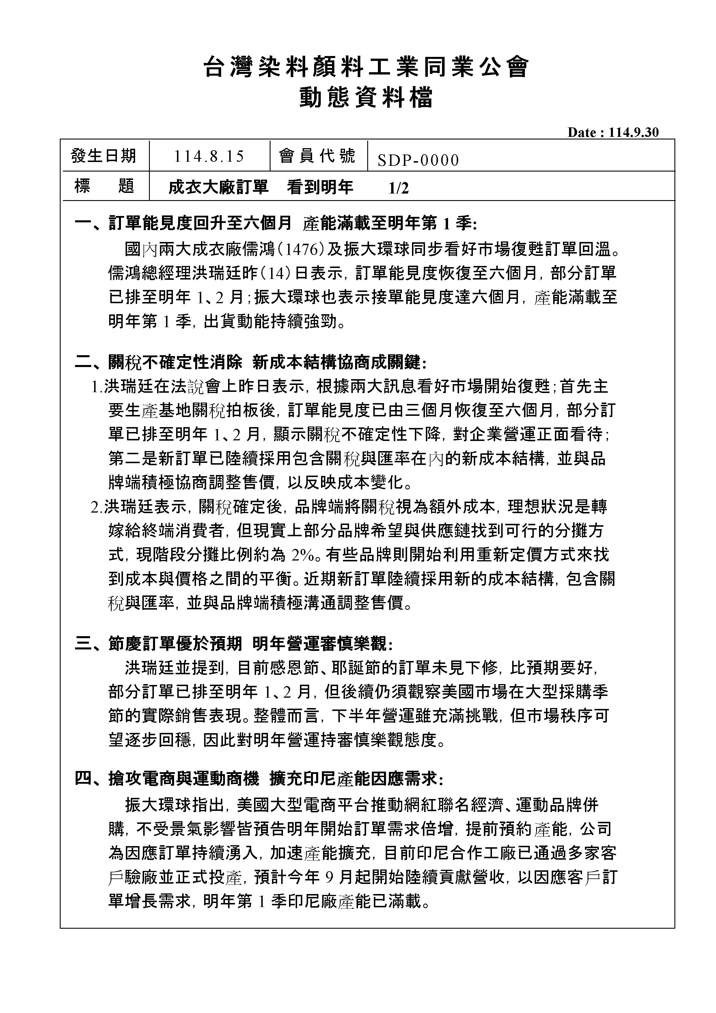 <動態消息> 成衣大廠訂單 看到明年