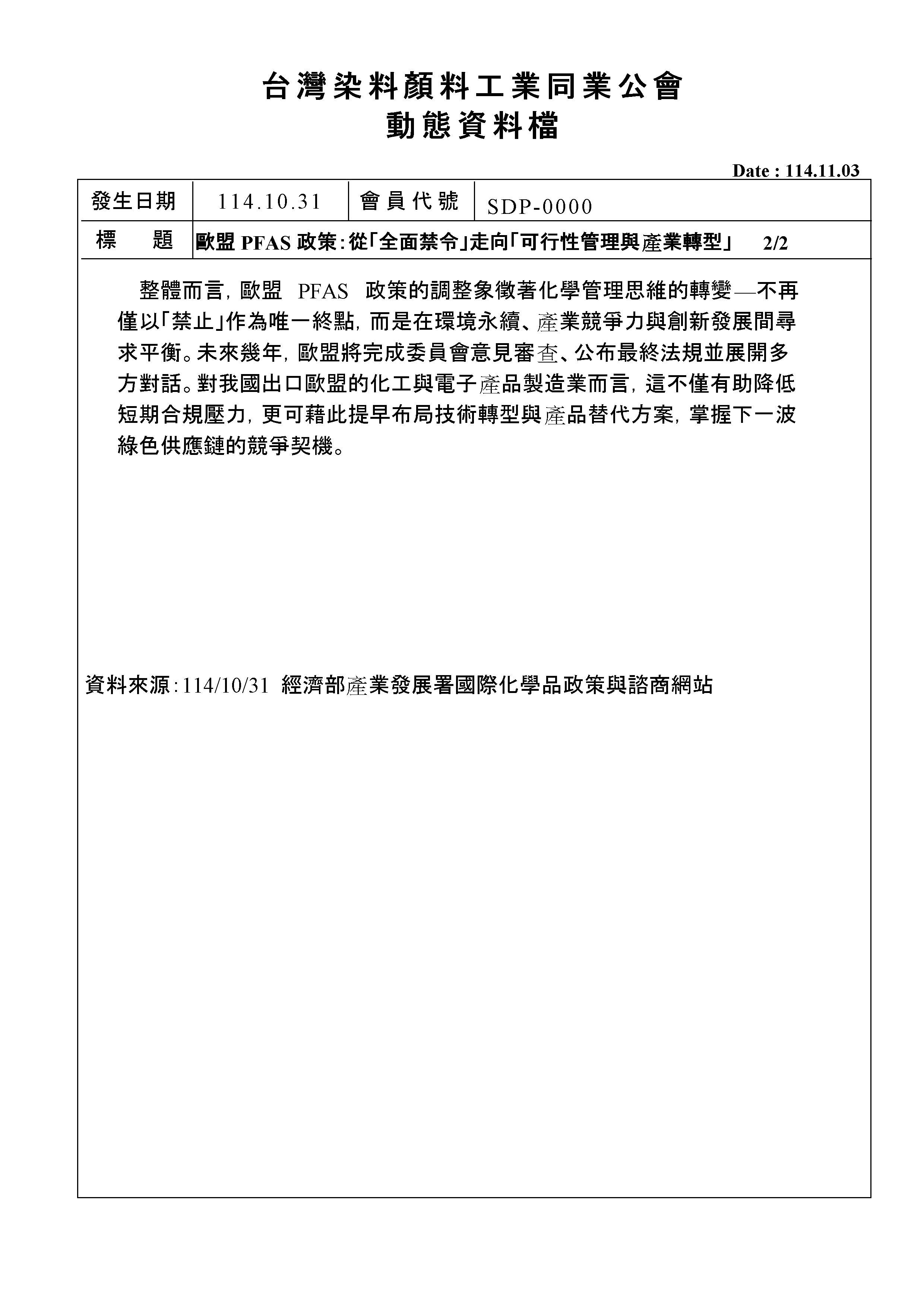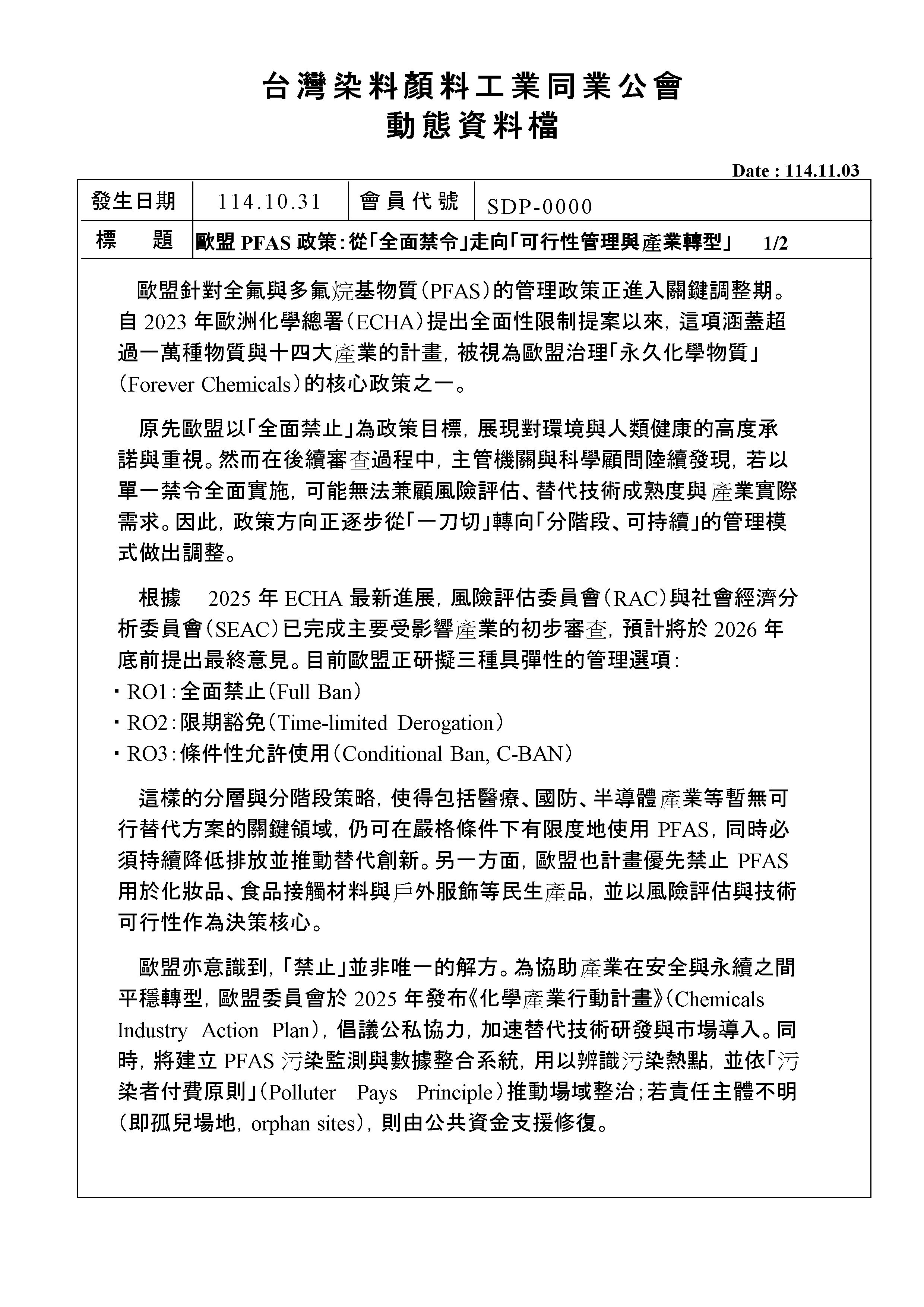 <動態消息>歐盟PFAS政策:從「全面禁令」走向「可行性管理與產業轉型」