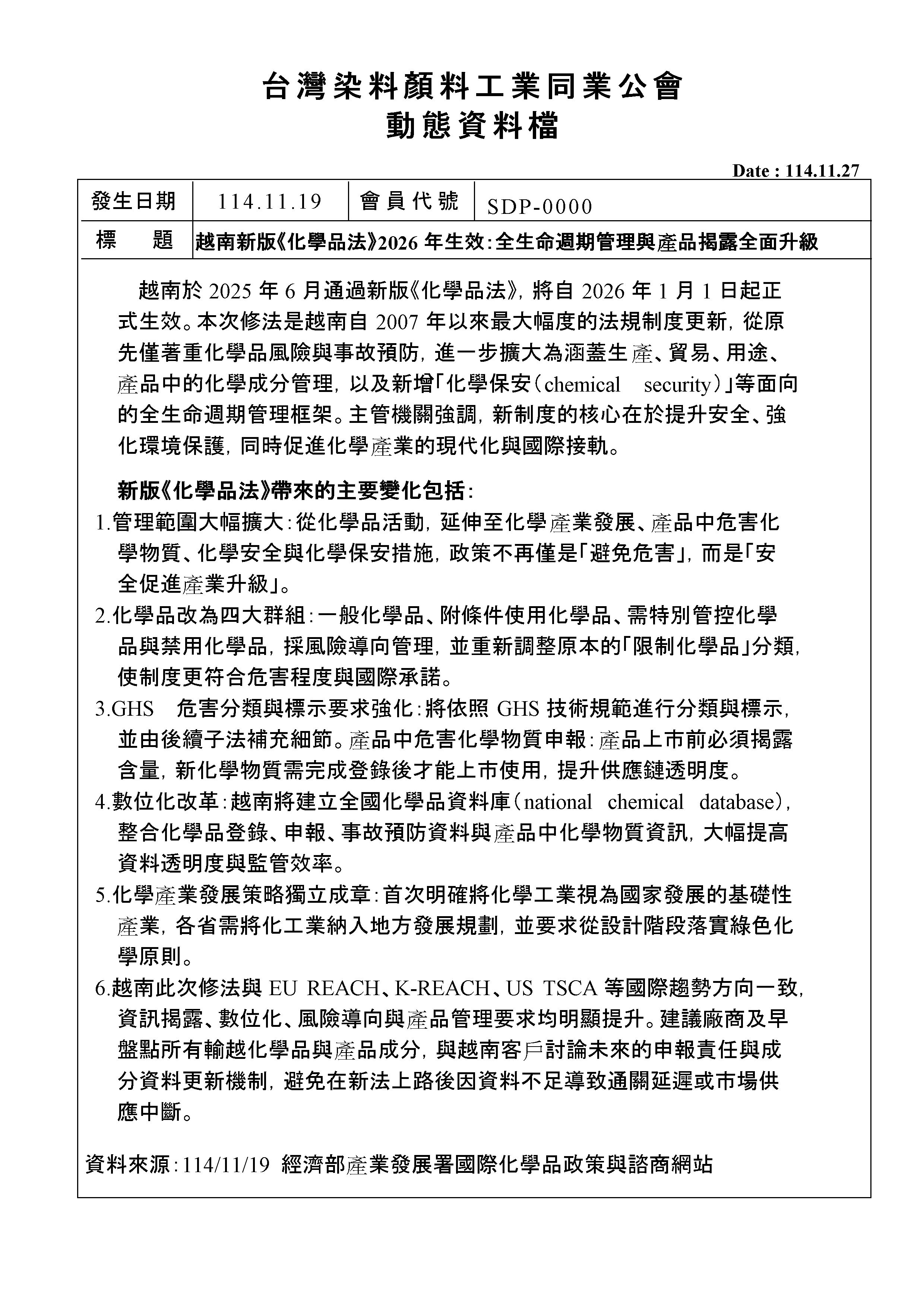 <動態消息> 越南新版《化學品法》2026年生效:全生命週期管理與產品揭露全面升級