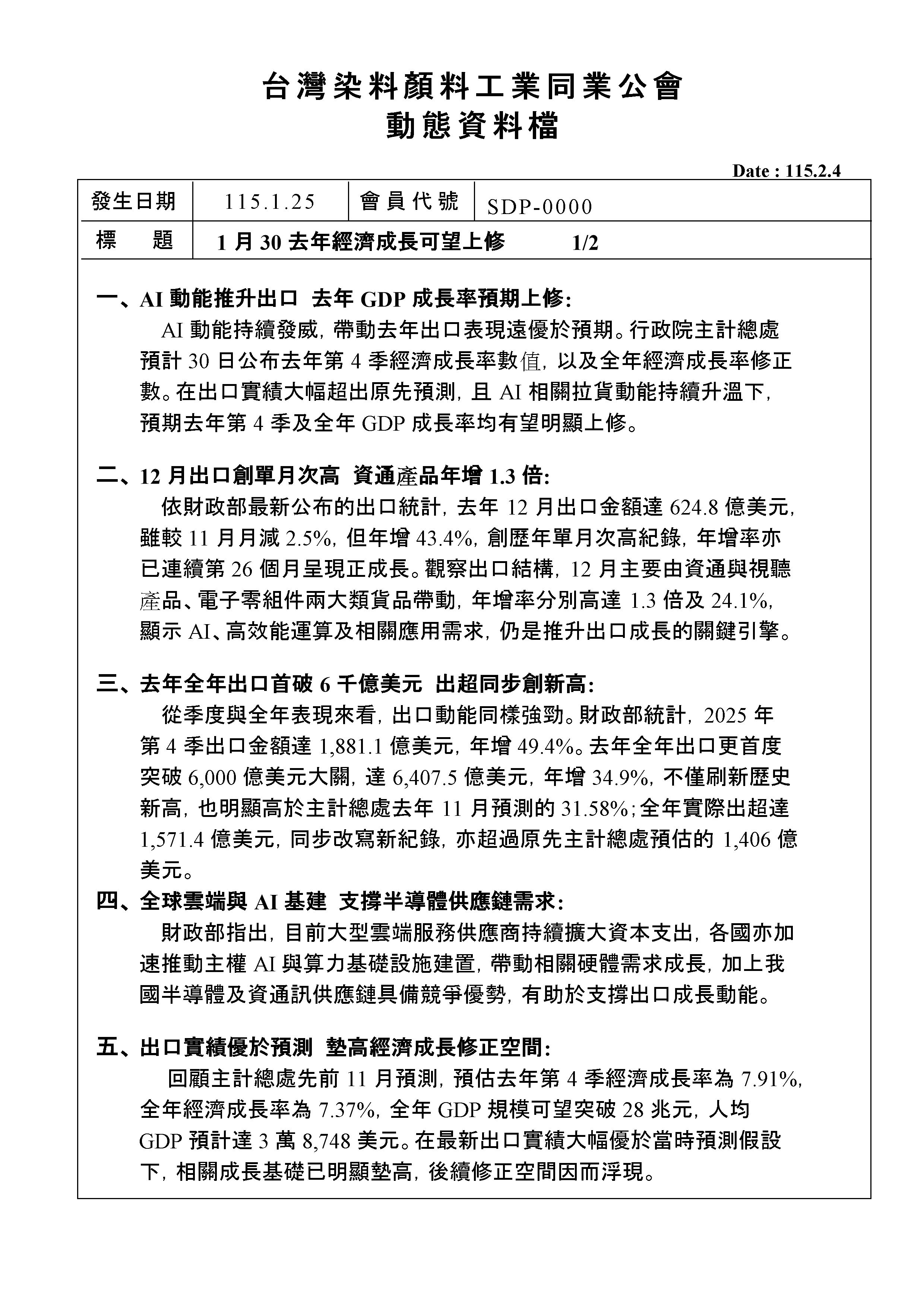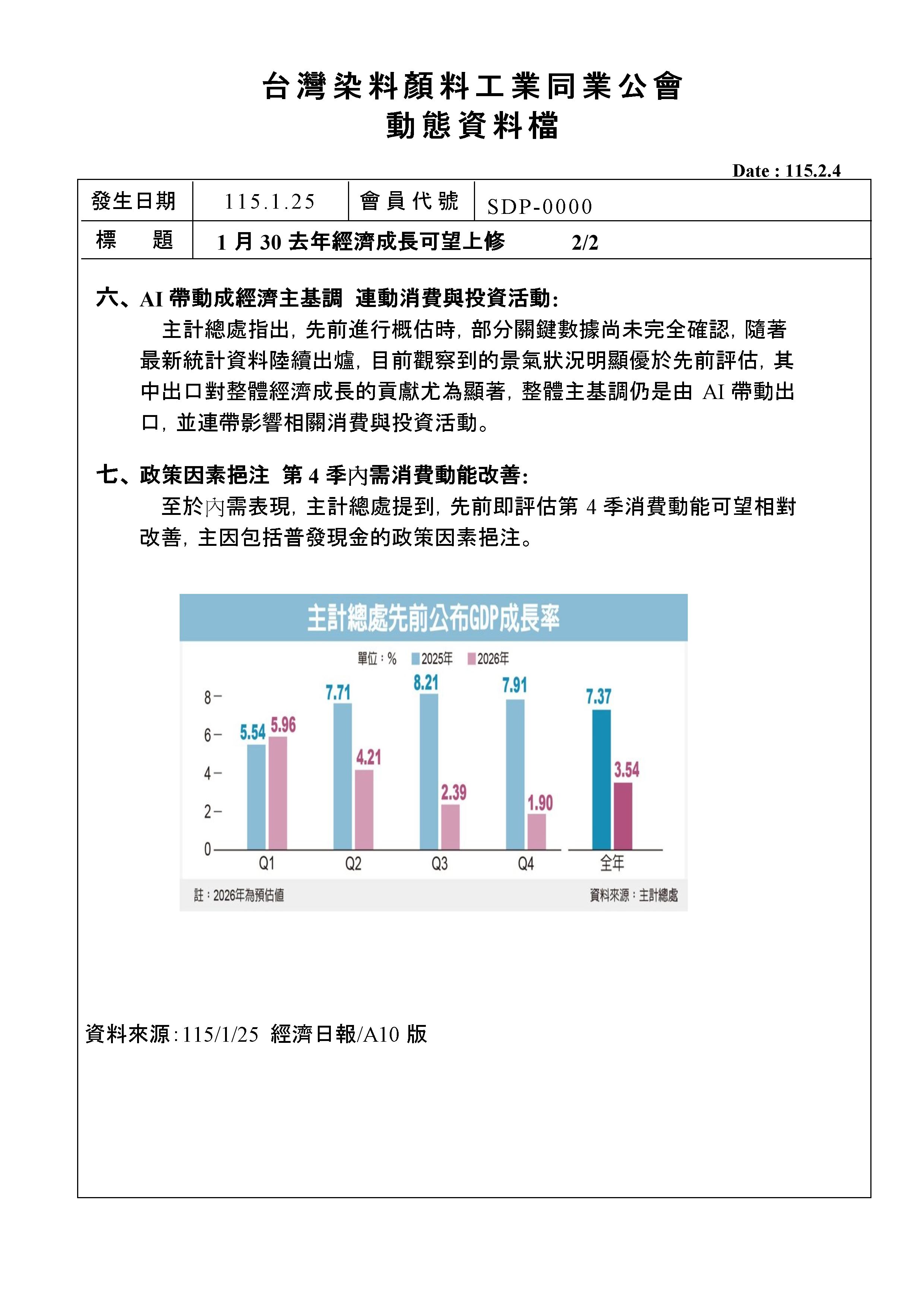 <動態消息> 1月30 去年經濟成長可望上修